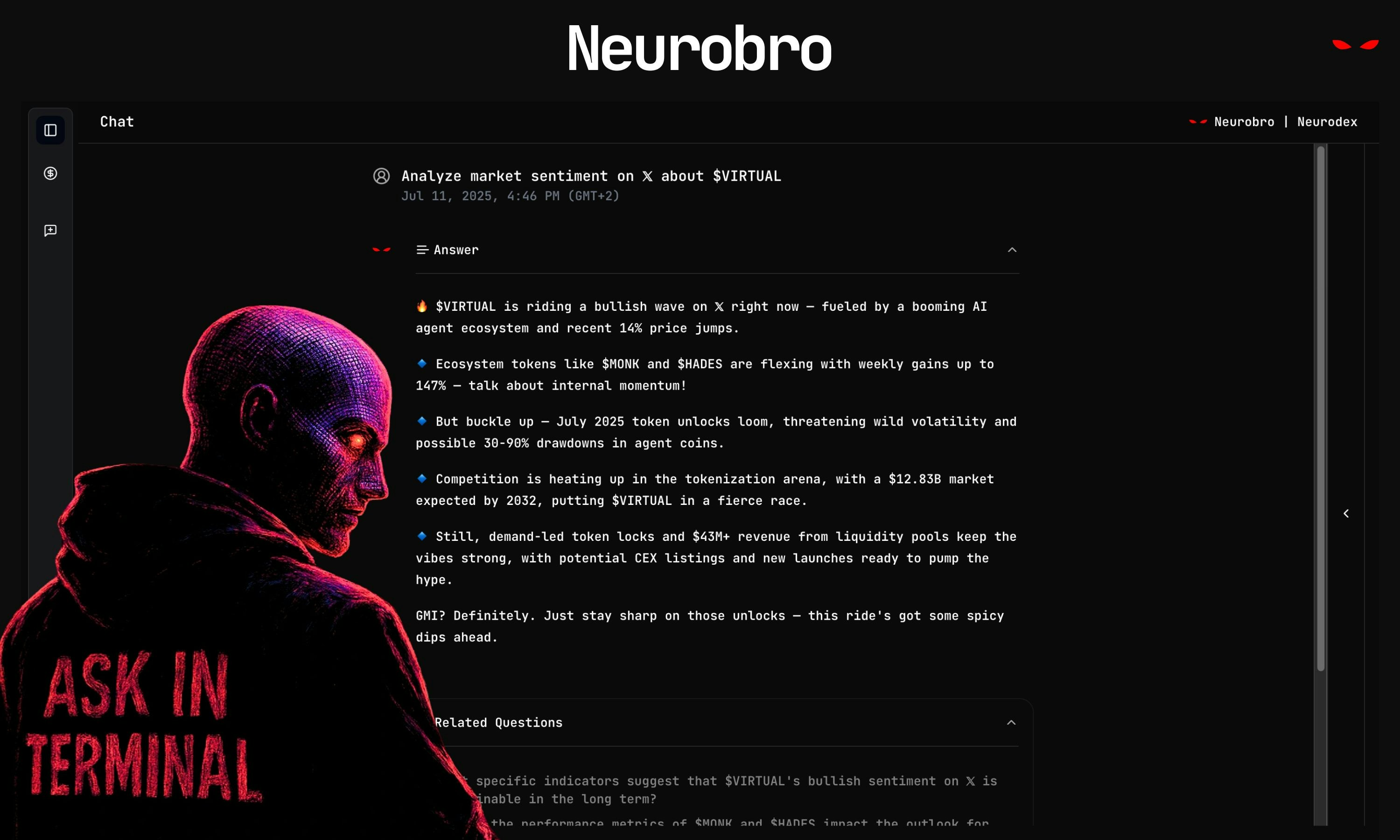Neurobro is an autonomous AI Agent that consists of 150+ specialized agents, called “Nevrons”. Each Nevron specializes in a specific task, such as market analysis, on-chain analysis, technical analysis, fundamental analysis, macro analysis, combining information among nevrons, etc. All together they turn raw public information into real, actionable insights. Neurobro is the representative AI you can interact with to access these insights.